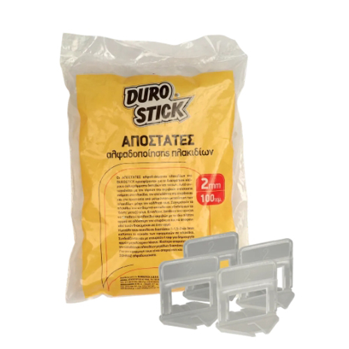 Οι ΑΠΟΣΤΑΤΕΣ αλφαδιάσματος πλακιδίων της DUROSTICK προσφέρονται για τη διασφάλιση πλήρους ευθυγράμμισης δαπέδων και τοίχων. Αυτό επιτυγχάνεται με την τήρηση της ακριβούς απόστασης ανάμεσα στα πλακίδια, την επιπεδότητα της επιφάνειας και την προστασία από μετακίνηση-μετατόπιση των πλακιδίων, μέχρι την κόλλησή τους. Συγκρατούν τα πλακίδια στο επιθυμητό επίπεδο και εξαλείφουν το ‘δόντι’ μεταξύ τους. Επιπλέον, βοηθούν τον τεχνίτη να τοποθετεί τα πλακίδια ακριβώς με το ίδιο πλάτος αρμού σε ολόκληρη την επιφάνεια και να αποφευχθεί τυχόν διακύμανση σε έναν αρμό. Η μεγάλη τους ποικιλία σε διαστάσεις 1-1,5-2 και 3mm καλύπτει το σύνολο των εφαρμογών σε πλακίδια. Συνδυάζονται και με σταυρούς ή ταφ για δημιουργία αρμών μεγαλύτερου πάχους. Ιδιαίτερα απαραίτητοι για την τοποθέτηση πλακιδίων μεγάλων διαστάσεων. Για την εφαρμογή τους είναι απαραίτητη και η χρήση ΣΦΗΝΑΣ αλφαδοποίησης.